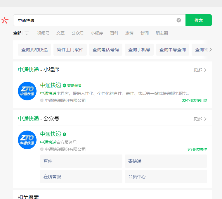 1、打開微信,點擊右上角搜索XX快遞,用戶可以自由選擇使用哪家快遞,只要搜索可以搜到,就可以點擊進入。(本文以中通快遞為例)