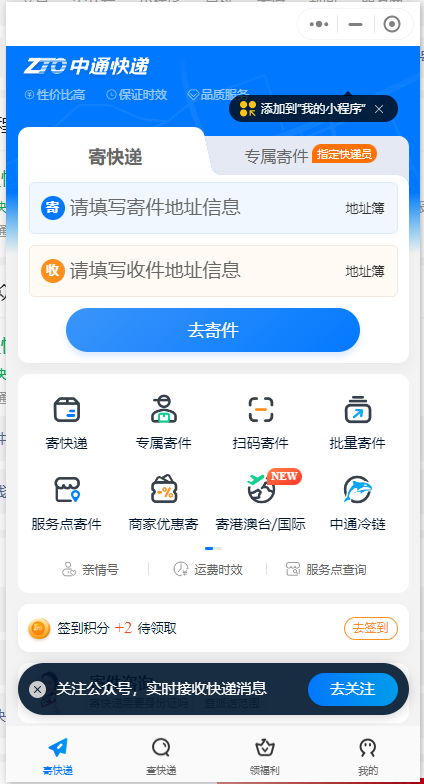 2、點擊中通快遞小程序進入首頁