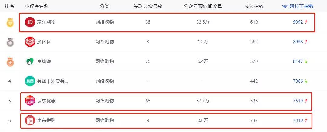 據(jù)最新的阿拉丁指數(shù)日榜顯示,在網(wǎng)絡(luò)購(gòu)物類(lèi)目下前6的小程序,京東就占了3個(gè),分別是京東購(gòu)物、京東優(yōu)惠、和京東拼購(gòu)。