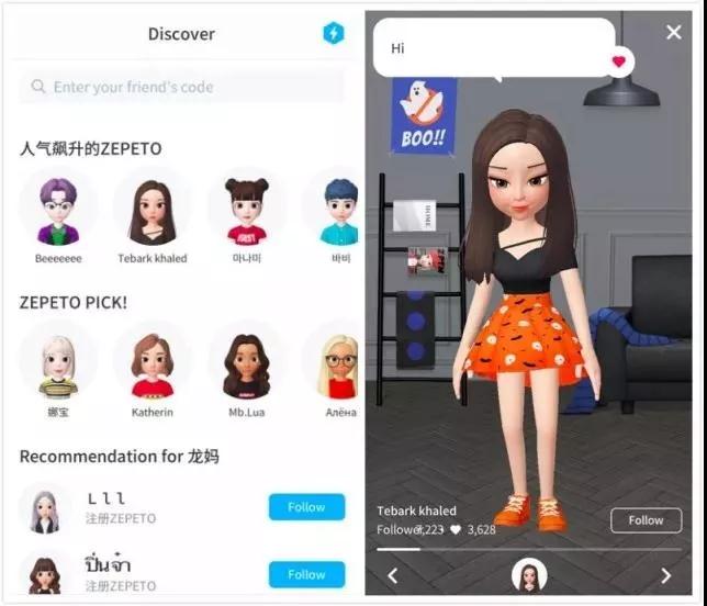 最后是陌生人推薦。在「發現」頁面,你會看到「人氣飆升」、「ZEPETO PICK」以及「為你推薦」,這是ZEPETO為你推薦的玩家,你可以選擇進入對方頁面,然后根據對方的形象、裝扮、空間環境等判斷對方的洗好和品位,進而決定是否要產生如關注、聊天等社交行為,而這也恰恰被眾多媒體解讀為ZEPETO試水陌生人社交的動作。
