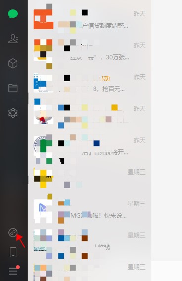 2、然后登陸電腦版微信后在界面看到下圖左側(cè)面板上有個(gè)小程序按鈕的圖標(biāo),這就是入口,點(diǎn)它。